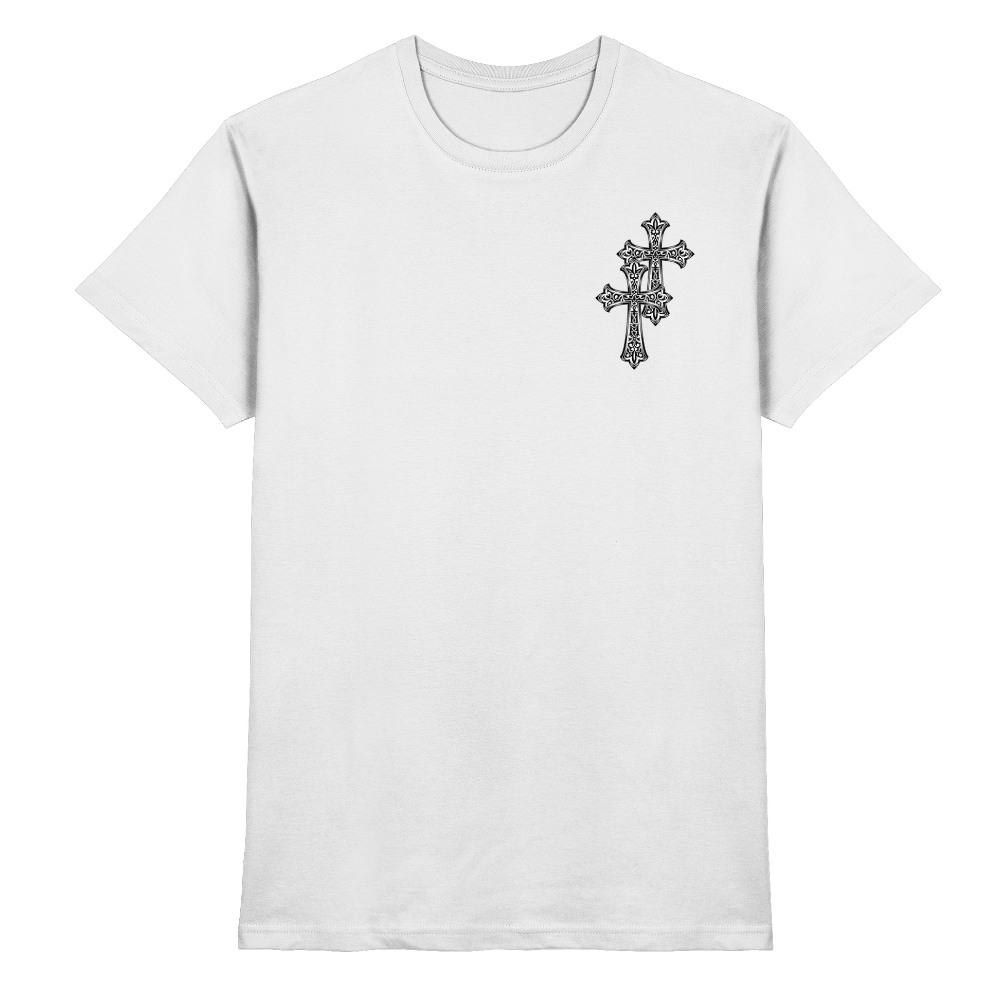 Mit dem "Cross - Premium Shirt" von Lumen Dei tragen Sie nicht nur ein Kleidungsstück, sondern eine Botschaft des Glaubens. Dieses Shirt verbindet hochwertige Materialien mit einem zeitlosen Design, inspiriert von christlichen Werten.